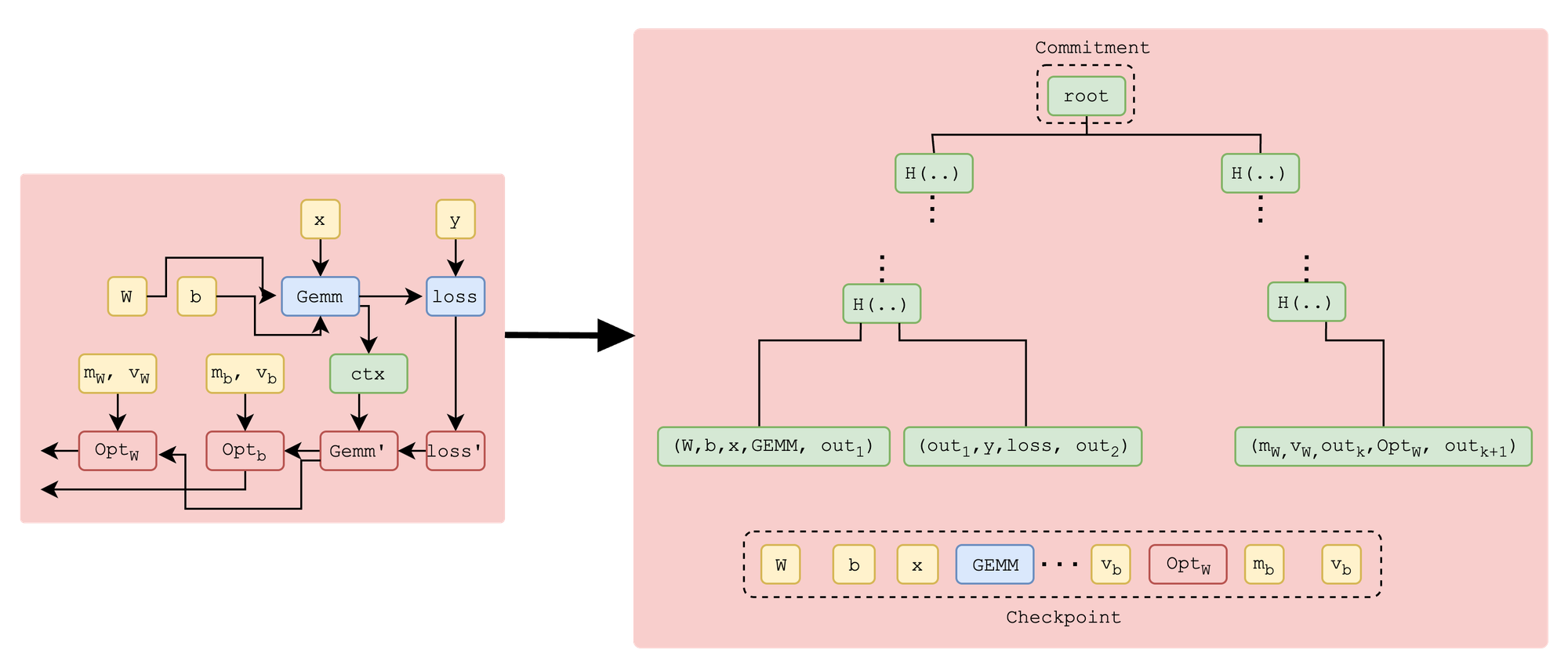 Thanks to its efficient dispute mechanism, refereed delegation has already been used in blockchain systems, such as optimistic rollups, where the chain itself acts as the referee. However, adapting refereed delegation to ML execution presents several challenges: pinpointing disagreements in an ML compute graph; the failure of naive re-execution due to non-associative floating point operations; and repetitive training steps that can explode task size when represented as a sequence of ordered operations.