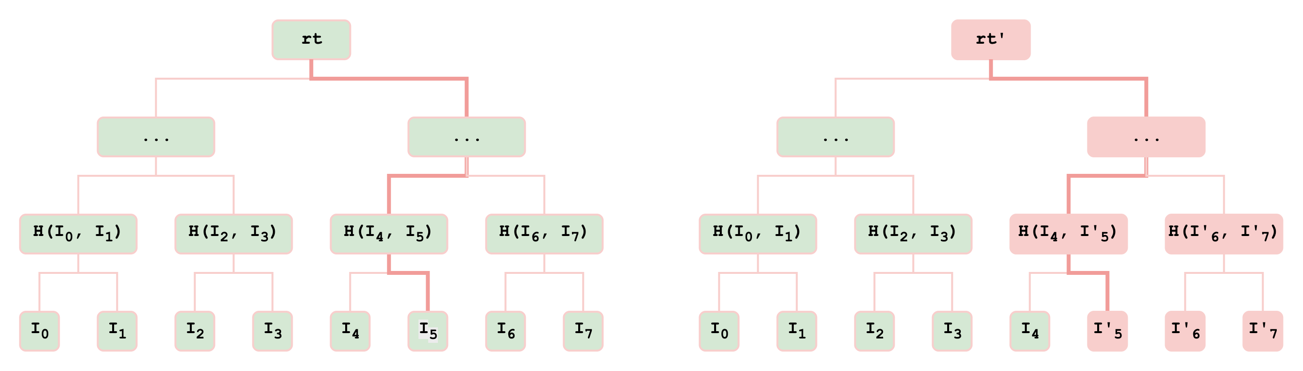 The two-level bisection game allows us to efficiently pinpoint disagreements at two levels: first at the iteration level, then at the operation level. To achieve this, compute providers commit to each training iteration (represented as a compute graph) via a Merkle tree where each node is a tuple of (inputs, operator, output) for the corresponding operator in the compute graph. In Figure 2, we illustrate a simple compute graph converted into a commitment. Later, each iteration commitment is combined into higher-level Merkle tree, as shown in Figure 3. Using the bisection game, at the higher level, we first pinpoint the first iteration where the providers disagree (iteration 5 in the example), then, within that iteration, we pinpoint the first disagreed operation. Finally, the referee executes that operation to determine which provider is honest.