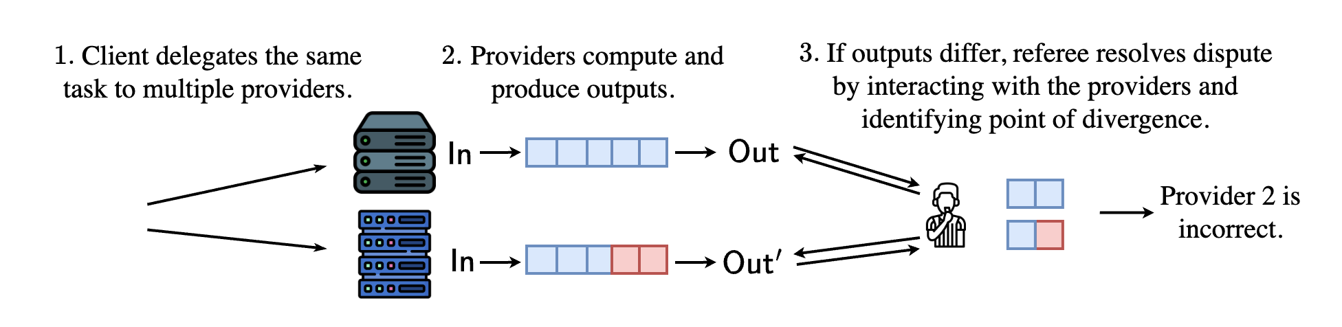 In execution-based methods, verification is done by checking whether the compute provider followed the exact steps of the task. This can be accomplished either through cryptographic proofs using SNARKs or through refereed delegation. SNARK-based proofs allow clients to verify execution correctness with low overhead, but generating such proofs costs orders of magnitude more than the task itself. For this reason, we use refereed delegation, where the task is assigned to two (or more) compute providers. Assuming at least one is honest, a referee or client can efficiently verify execution correctness.