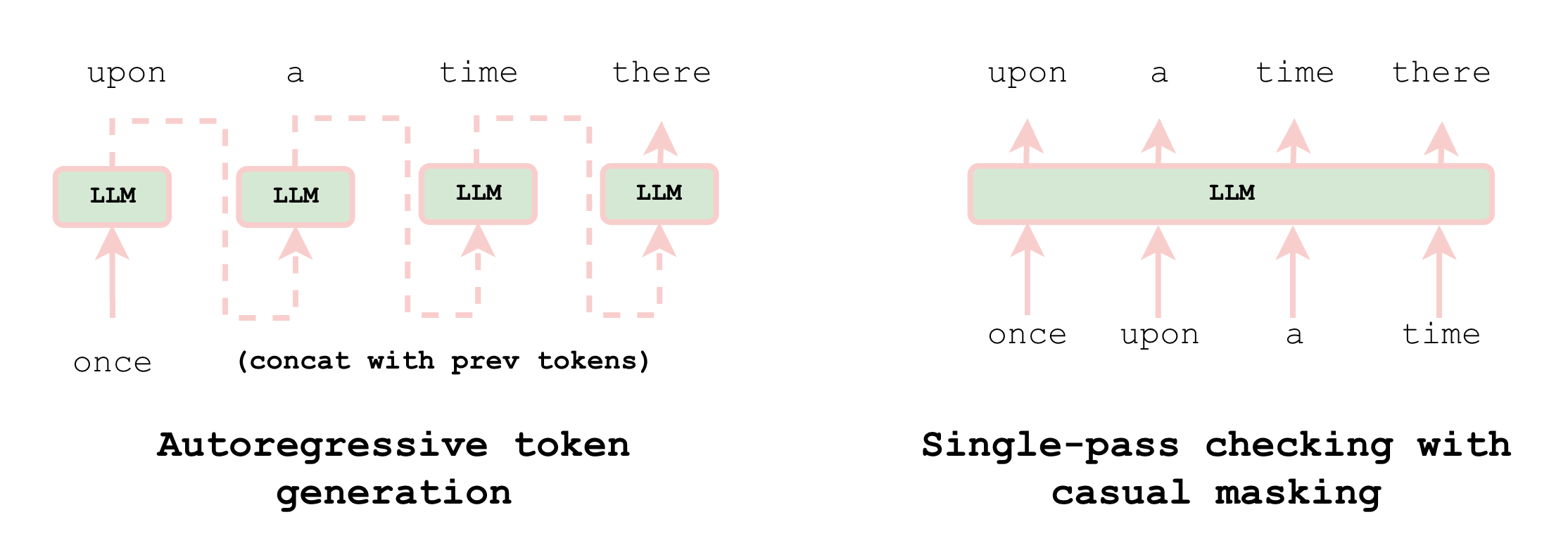 Common LLMs are autoregressive models where each token generation is done through a single forward pass, which is then concatenated with the input for the next token generation. Similar to the teacher forcing method, autoregressive token generation allows verification of generated tokens in a single forward pass (via causal masking)—the same technique used in speculative decoding. This reduces the overhead of verifying an inference task to a single forward pass.