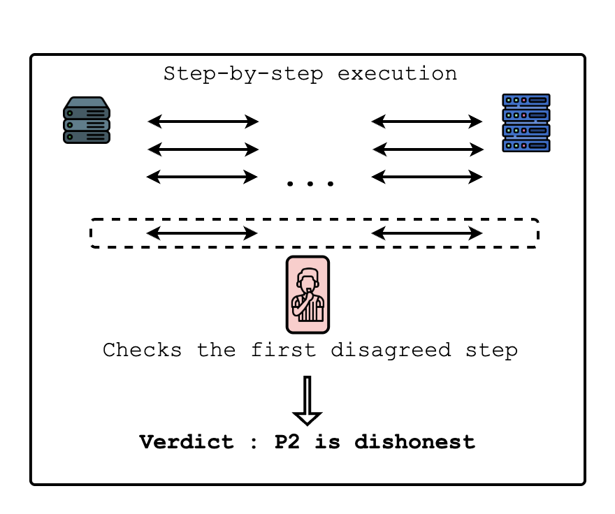 - If the outputs differ, arbitration starts. Two-level bisection game pinpoints the first disagreed operation.